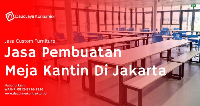 Jika Anda ingin membuat Meja Kantin berkualitas untuk Kantor, Pabrik, Sekolah dan untuk fasilitas lainnya. Daud Jaya Kontraktor solusinya, dengan harga yang kompetitif dan bahan baku yang berkualitas serta tim tukang yang berpengalaman dibidang nya, sangat tidak diragukan kualitasnya dan testimoni kepuasan dari para pelanggan yang sudah menggunakan jasa Custom Furniture di Daud Jaya Kontraktor.